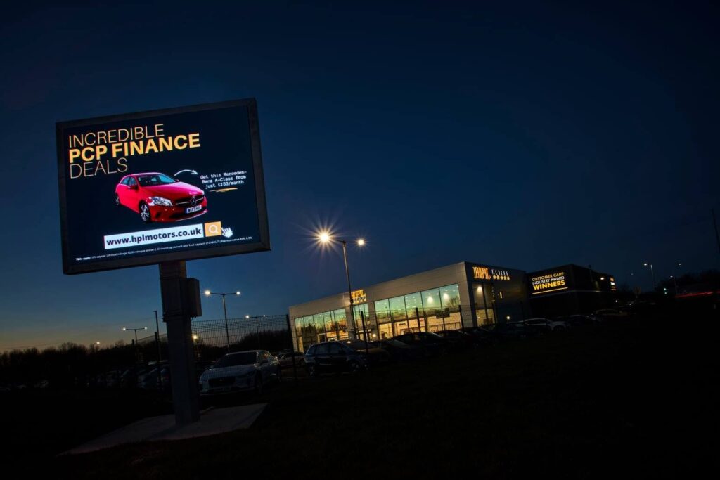 HPL motors is a family-run business established in 1992. From humble beginnings on a 16- car forecourt, HPL is now the leading used car supermarket in the North West and in the Winner of the ‘motor Trader Industry Awards’ in 2018 and 2019. HPL were expanding their business, adding a new site in Preston. The team at HPL wanted a way to stand out from the crowd at this new site and to attract customers passing by on the main road near the site. This new forecourt in Preston offered the perfect opportunity to capture customers from the busy road next to the site. HPL spoke to our team about ways to use roadside LED digital signage to gain customers, increase brand awareness and promote stock. They also wanted the opportunity to quickly change the artwork and to have full control over the display.